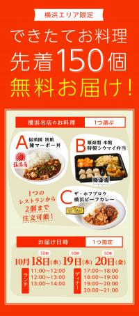 明日10/18から、「タダうま」キャンペーンでタダで、横浜の有名店のお料理を届けてくれるらしいのが、とっても気になります!おやじギャグっぽいのに一度聞いたら忘れられない「タダうま」のネーミングの由来もキニナル!
