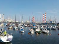 根岸湾の横浜市民ヨットハーバーに、いつの間にか「赤白の煙突が4本立ってる!」と驚きました。でもよく見たら、クレーン付きの台船でした。何か工事が行われるのでしょうか。景観の面でちょっと残念です。いつ頃までに、何が行われるのか、気になっています。