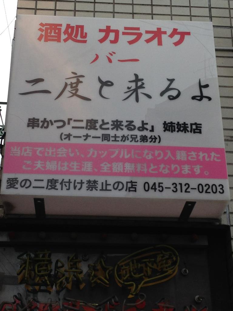 戸部駅ガード下すぐに串カツ「二度と来るよ」さんの姉妹店のバー「二度と来るよ」があり、看板にこちらで出会い入籍したカップルは生涯飲食無料と書いてあり、かなり気になります。普通にただ呑みたいだけでは入りにくい感じなのでぜひレポお願いします(笑)