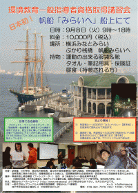 当事者(船員)ですみません。9月の19日まで横浜みなとみらい「ぷかり桟橋」に「帆船みらいへ」が停泊しています。日本初となる民間での帆船事業がスタートして早1年半。名誉船長にはタレントのタモリさんに就任頂くなど少しづつ活動を広げています。一般の方が自由に乗れる帆船として日帰り体験乗船などおこなっておりますが、9月8日には日本初となる帆船の上での環境教育指導者認定講習会を行います。