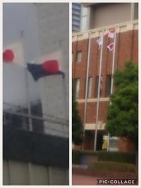 赤レンガ倉庫からナビオス横浜に向かうところにある庁舎で、日の丸の横に斜め半分に色のついた旗(写真左)が上がっていました。あれは何かなと思っていたら、ナビオスにも変わった旗(写真右)が上がっていました。あれは何でしょう?