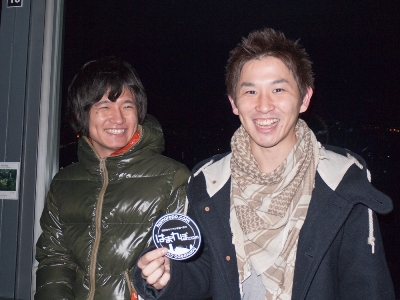 タクジさんとシンジさんはナイスな笑顔でステッカーを持ってくれました