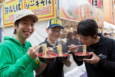 エイサーを踊る「町田 琉」メンバーがステージ前に沖縄そばでお腹ごしらえ