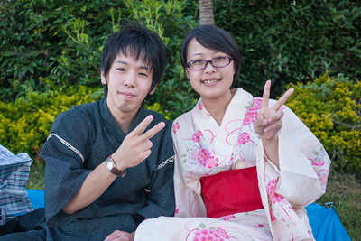 「これぞ夏という感じですね」と言うと「でも、甚平と浴衣が緑と赤でクリスマスカラーみたいになっちゃって」とニコニコ話してくれた愉快なお2人!