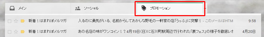 右端の「プロモーションタブ」にメールが届きます