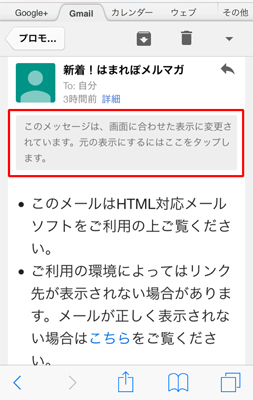 →スマートフォンなどでGmailアプリをご利用の際、幅の制限により表示崩れが確認されています。今後、正しく表示されるよう対応していきますが「このメッセージは、画面に合わせた表示に変更されています。元の表示にするにはここをタップします」をタップしてください。正しく表示された内容でメルマガを確認することができます。