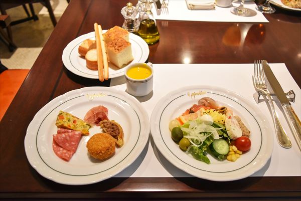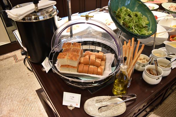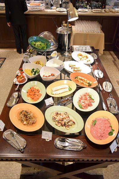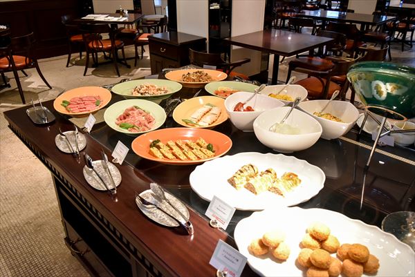 ビュッフェのテーブルには、前菜やサラダ、パン、スープなどがずらりと並ぶ。好きなものを好きなだけチョイス可能だが、思わず目移りしてしまうことだろう。