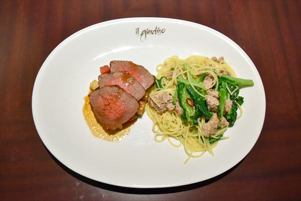 パスタは「富山ポークのサルシッチャと野菜のスパゲッティ(ロッソまたはビアンコ)」と、「スパゲッティペペロンチーニ」、「サーモンクリームのペンネ」から、メインは「今月の魚料理」と「今月の肉料理」から、1種類ずつ自由に組み合わせることができる。取材時はそれぞれ、「カジキマグロのグリル」と「牛肉のロースト」を選ぶことができた。