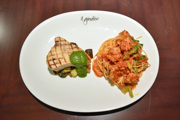 カジキマグロのグリルと富山ポークのサルシッチャと野菜のスパゲッティ(ロッソ)