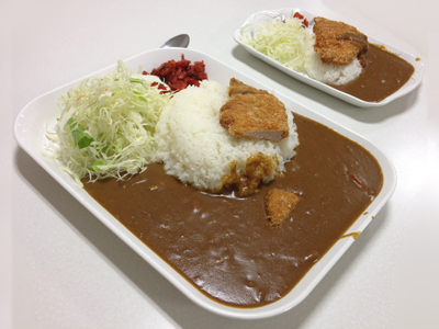食堂内で販売している通常のカツカレーと比べて、量は約3倍(ご飯の量は450g)!といっても普通の人がちょっと頑張れば食べられるレベルです。味は可もなく不可もなく!