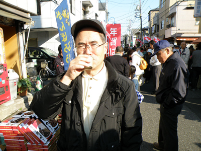 復興支援ブースで、福島の地酒を試飲中の関根さん