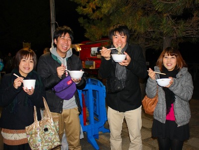 市内から来ているそうですが、なんと6年連続でカウントダウンは八景島シーパラダイスをチョイスしているんだとか。寒いので屋台のモツ煮込みを食べていらっしゃいました。