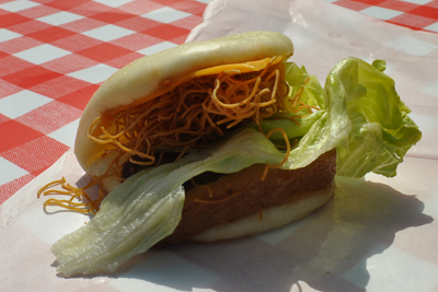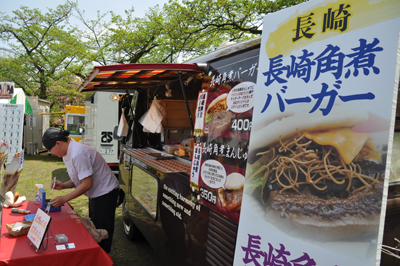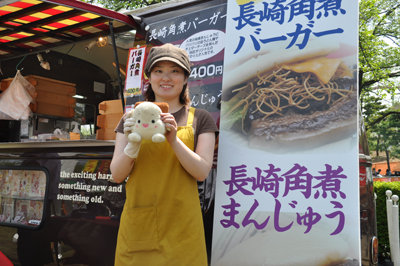 茶色いワゴンが目印の長崎角煮バーガー。1つ400円