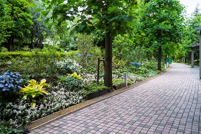 花や緑に囲まれた遊歩道の先に目指すバーベキューガーデンがある。