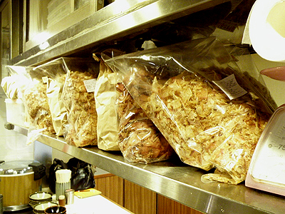 藤島さんによれば、見た目が濃い関東ダシの対極として、あえて京都より遠く離れた「博多風」にしていることのこと。使われる材料は、ムロアジ、サバ、ソウダガツオ、フシ(深海魚の一種)、カツオの5種類の魚と、利尻コンブの高級品なのだそうだ。