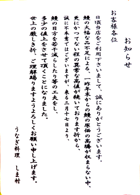 「いままでに比べて形は変わりましたが、価格は上げずにやっています。鰻が小さくなることは実質の値上げですから、こうしたお知らせにしています」とのこと。