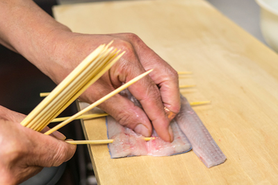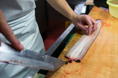 見事な手さばきで裂かれる鰻。包丁の形は地方によって異なる