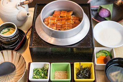 鰻釜はひつまぶしに似たセットで、すりおろしたとろろが薬味についてくる。うなとろで締めるとまろやかでさっぱりした後口だ。