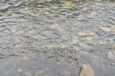 一見、藻ばかり見えて魚がいそうには見えない。諦めかけたころ、今宿団地を過ぎたあたりで見下ろすと、コイの群が悠然と泳いでいた。丸々とサイズも大きく、数十匹はいるだろうか。