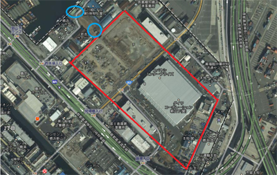赤で囲った場所が貯木場のあったところ。青い丸が水門の位置だ