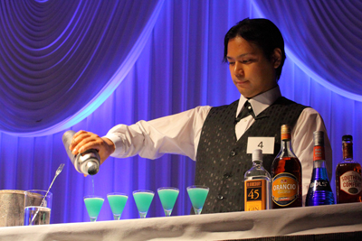 壇上に上がった選手は持ち時間6分の中で5杯のオリジナルカクテルを作らなければならない。