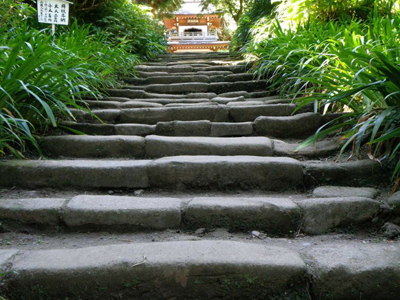 住職によれば、この石段は関東大震災で崩れたのをきっかけに、修復したのだそうだ。ということは、たった100年間余りで、ここまで摩耗したことになる。「鎌倉石を使うと風化が早く、古寺の雰囲気になじむのが早かった」と住職は言う。