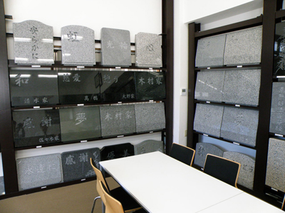 さまざまな石材サンプルが並ぶ、本社1Fの様子