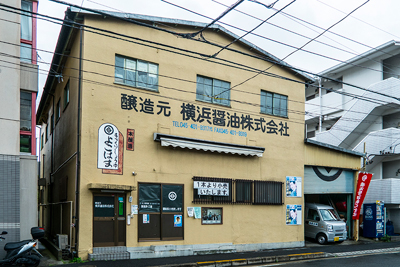 建物に大きく「醸造元 横浜醤油株式会社」と書かれている。入口の上には、「手づくりしょうゆ よこはま」という文字の上に浜菱がある。