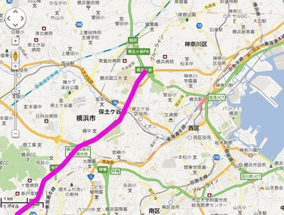 紫のラインが横浜新道。今の海岸線まで一番近い場所でも3キロほどある