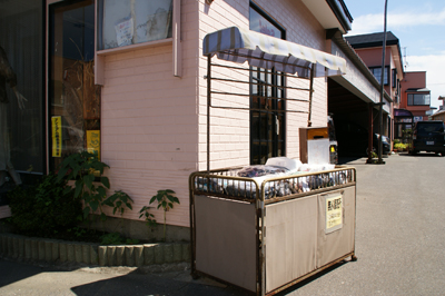 バス停近くの店の無人スタンド。野菜は神奈川でも見かけるけれど、衣類の無人スタンドは珍しい?