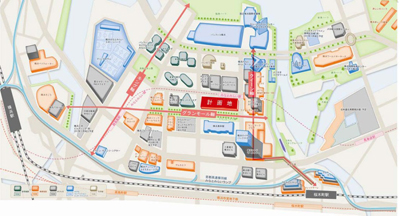 34街区ショッピングモールの1Fは実は周囲の道路面より3m高く、グランモール公園と同じ高さにそろえてあり、主な出入口は公園側に設けてある。