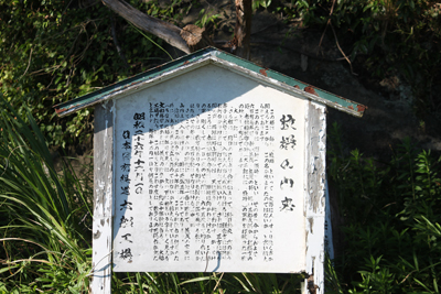 フェンスの中には入れないようになっているので、カメラの望遠レンズで確認すると、白い立て看板には「泣塔」と書かれていた。正式にはそのように書くようだ。また、先ほどの中央に見えていた岩肌の所に「泣塔」を発見。