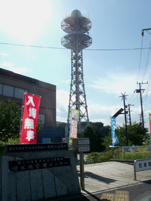 新横浜の鶴見川流域センターの横にあるレーダーみたいなタワーはなんでしょうか?センターの建物にケーブルがつながっているように見えますが・・・(ぱなさんのキニナル)