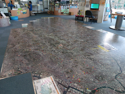 入口から一歩足を踏み入れると、床いっぱいに地図が広がっている。鶴見川流域の空撮写真だ。