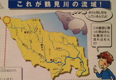 鶴見川の全長は約42.5km。その流域は東京都町田市、稲城市、神奈川県川崎市、横浜市にまたがっており、その形から「鶴見川流域はバクの形」をキャッチコピーにしている。