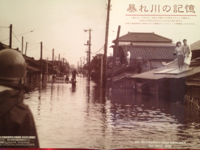 配布資料より。昭和33年、台風22号で鶴見川が氾濫した鶴見区鶴見市場付近