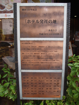 店の横にはホテル発祥の地を記す記念碑が建っている。