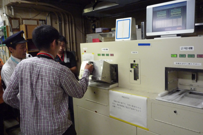 金庫内のお金を回収する作業や、ドライバーのアルコール検知器などを見学・体験した。