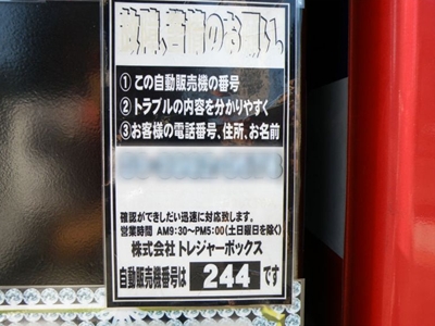 自販機を注意深く観察してみると、どうやら、都内に本社を持つ株式会社トレジャーボックスという会社が運営しているようだ。記されていた電話番号に連絡し、後日改めて取材させていただくことになった。