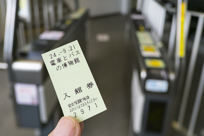 踏切の先へ進むと博物館入口。券売機と自動改札がある。入場券が切符になっていて、自動改札を通って中に入っていく。