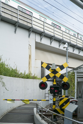 この踏切は、宮崎台の駅を通過する急行に連動していて、電車が近づくと警報器が鳴って閉まる。