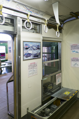 8090系は、ドアの内側や座席の内部が見えるようになっていて、ドアの開く仕組みなどがわかるようになっている。