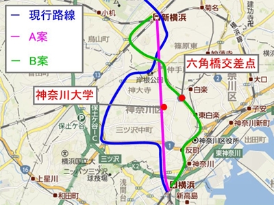 当時、市が最も望んでいたのは、横浜~新横浜を一直線に結ぶ上図A案だった。最短路線なので、工事費も安く済むし、所要時間も短縮できる。しかし、 I さんにとって一点、懸念する点が。上図A案は神奈川大学周辺を通るのだが、実は、これが I さん宅の真下にあたる。 I さんが反対した理由の一つには、このことがあるとされる。