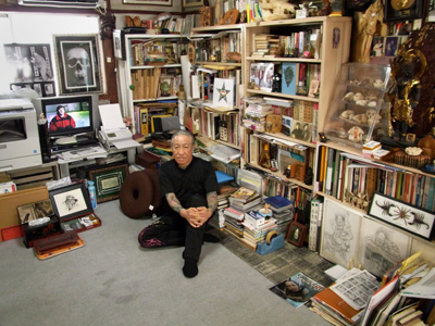 刺青にまつわる資料やコレクションの頭蓋骨に囲まれた3代目彫よしさん