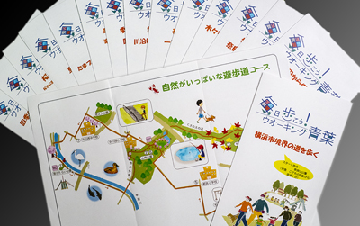 健康づくり係長という見村さんの肩書にぴったりの、「毎日歩こうウォーキング青葉」という青葉区内のウォーキングコースを紹介するリーフレットも作成されている。青葉区は散歩したくなる場所がたくさんあるということで、なんと16コースもある。