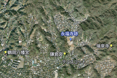 永福寺(ようふくじ)跡の場所は、若宮通りを鶴岡八幡宮で突き当たった右手奥、鎌倉宮から瑞泉寺へ向かう道の左手。