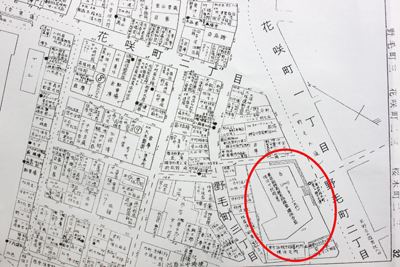 地図中の建物の名前は手書きで小さく、文字はとても読みにくいが、“税務署”や“空き地”などの文字は読み取れるので、どうやらこの場所には“税務署”があったようだ。