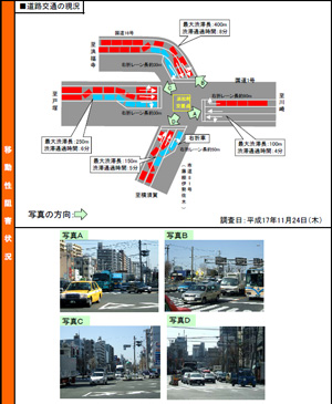 浜松町交差点は国道1号と16号の交差点で、1日に約7万5000台の車が利用している。主要道路同士の交差点なので、一般の交差点に比べて、右左折する車が多い。