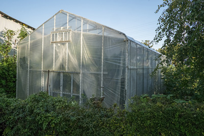 一般的な温室は高さ2.5mだが、この温室はトップが4m、サイドが3.5mの高さ