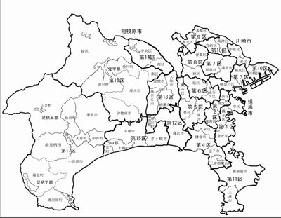 神奈川県には18の小選挙区があり、そこから18人が選出されるのだが、これは2002(平成14)年に前出の「衆議院選挙区確定審議会」の勧告により改定が行われた後のもの。